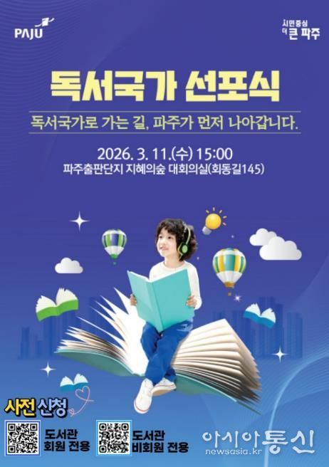 [아시아통신] 파주시는 오는 11일 15시, 파주출판도시 지혜의숲 대회의실에서 ‘파주시 독서국가 선포식’을 개최하고 책 읽는 도시를 넘어 ‘독서국가’로 나아가기 위한 힘찬 출발을 알린다.
