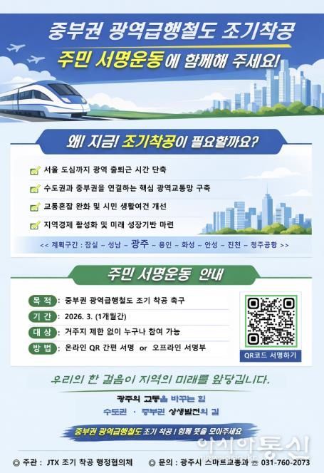 [아시아통신] 광주시는 중부권 광역급행철도의 조기 착공을 촉구하기 위해 3월 한 달간 주민 서명운동을 한다고 6일 밝혔다.