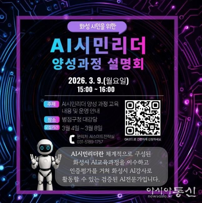 [아시아통신] 화성특례시는 시민이 학습하고 교육하는 인공지능(AI) 학습 체계 구축을 위해 ‘2026년 AI시민리더 양성 교육’ 설명회를 3월 9일 오후 3시에 병점구청 대강당에서 개최한다.