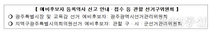 또한, 「공직선거법」 제53조 제1항에 따른 공무원 등은 3월 5일까지 사직해야 공직선거에 입후보가 가능하나, 광주특별시 시장 및 교육감 선거에 입후보하려는 공무원 등은 특별법에 따라 3월 15일까지 사직하면 입후보가 가능하다.