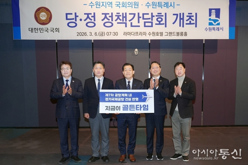 이재준 수원특례시장은 6일 라마다프라자 수원호텔에서 열린 지역 국회의원들과 당·정 정책간담회에서 “제7차 공항개발 종합계획에 ‘경기국제공항’ 건설 내용이 반영될 수 있도록, 경기도와 협의해 달라”고 요청했다.