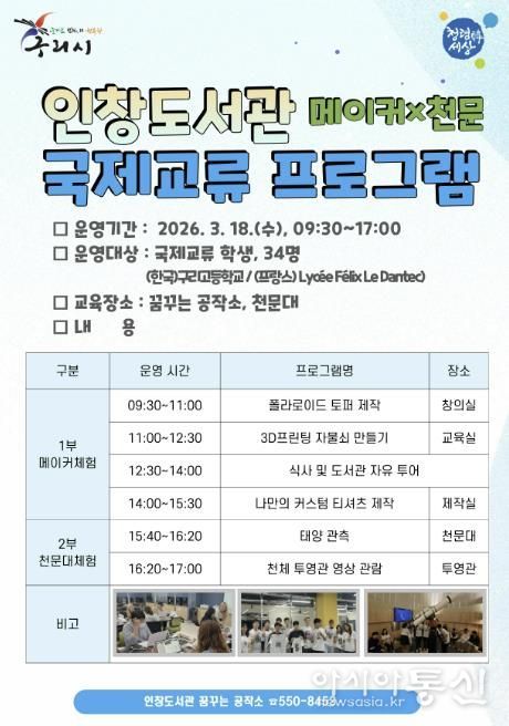 [아시아통신] 구리시 인창도서관 꿈꾸는 공작소는 오는 3월 18일, 관내 학교의 국제교류 학사 일정과 연계해 외국인 학생들에게 한국 도서관의 특화된 메이커 문화와 천문 관측 활동을 소개하는 ‘메이커×천문 국제교류 프로그램’을 운영한다.