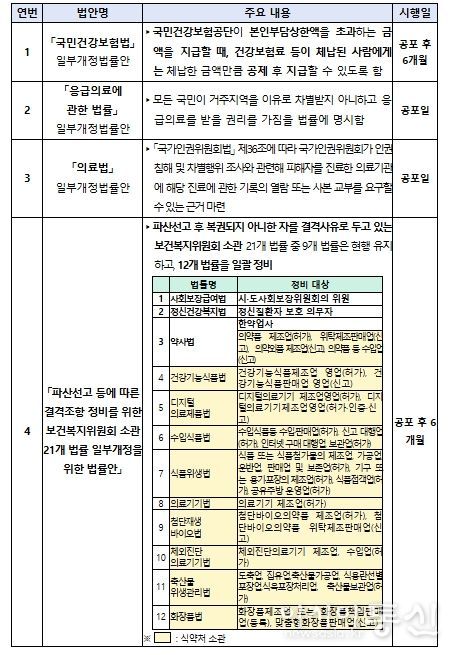 [아시아통신] 보건복지부는 3월 12일 제433회 국회(임시회) 본회의에서 '국민건강보험법'·'응급의료에 관한 법률'·'의료법' 일부개정법률안, '파산선고 등에 따른 결격조항 정비를 위한 보건복지위원회 소관 21개 법률 일부개정을 위한 법률안' 등 보건복지부 소관 4개 법률안이 의결됐다고 밝혔다.