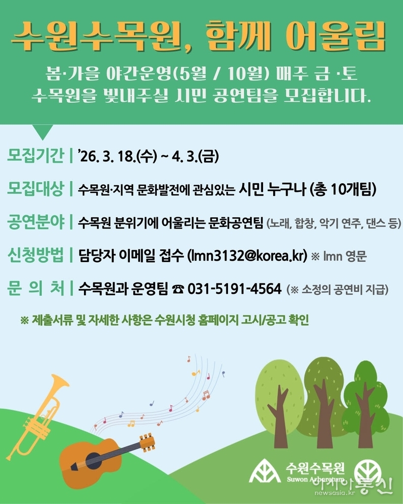 수원특례시(시장 이재준)가 수원수목원에서 열리는 시민 참여 문화공연 ‘수원수목원, 함께 어울림’에 참여할 시민 공연팀을 4월 3일까지 모집한다.