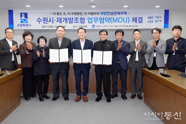 수원시와 111-3구역(영화동)·영통1구역(매탄1동) 재개발 조합은 27일 시청 상황실에서 ‘새빛안심전세주택 조성·인수 업무협약’을 체결했다.