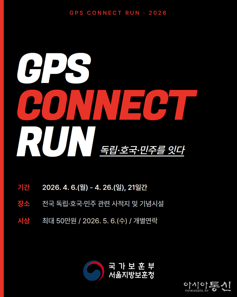 국가보훈부 서울지방보훈청(청장 이승우)은 전국 보훈 사적지를 달리는 비대면 러닝 이벤트 'GPS 커넥트 런: 독립호국민주를 잇다'를 오는 6일부터 26일까지 21일간 개최한다고 밝혔다.
