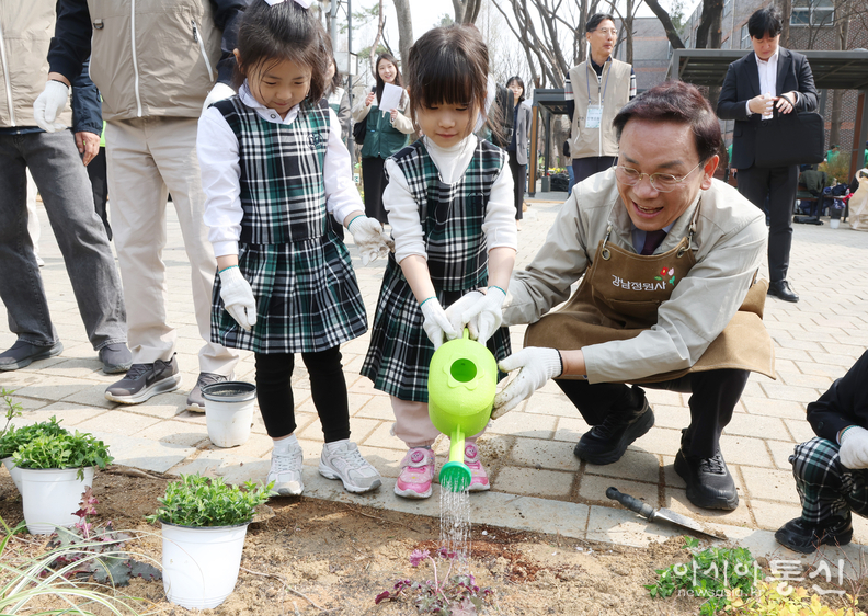 이날 행사에는 기부자와 주민, 어린이, 새마을지회, 강남정원사 등 500여 명이 참여해 산딸나무와 단풍나무 등 교목 94주, 영산홍과 사철나무 등 관목 1,000주를 심고, 초화류 정원과 벤치 등을 함께 조성했다.