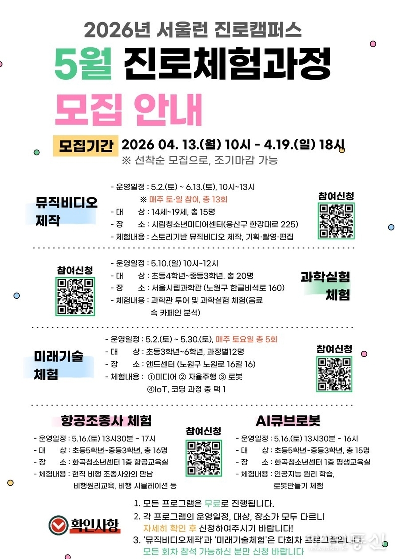 서울시는 4.13.(월)~4.19.(일) 서울런을 수강하는 초등~고등학생 중 ‘서울런 진로캠퍼스(5월)’에서 미래 기술 관련 직무를 체험할 총 114명을 모집하고 내달부터 진로체험 지원에 들어간다고 밝혔다. 시는 올 하반기에는 로봇, 엔터, 건축 등 민간기업과의 협업을 통해 진로 탐색을 실제 산업 현장으로도 확장할 계획이다.