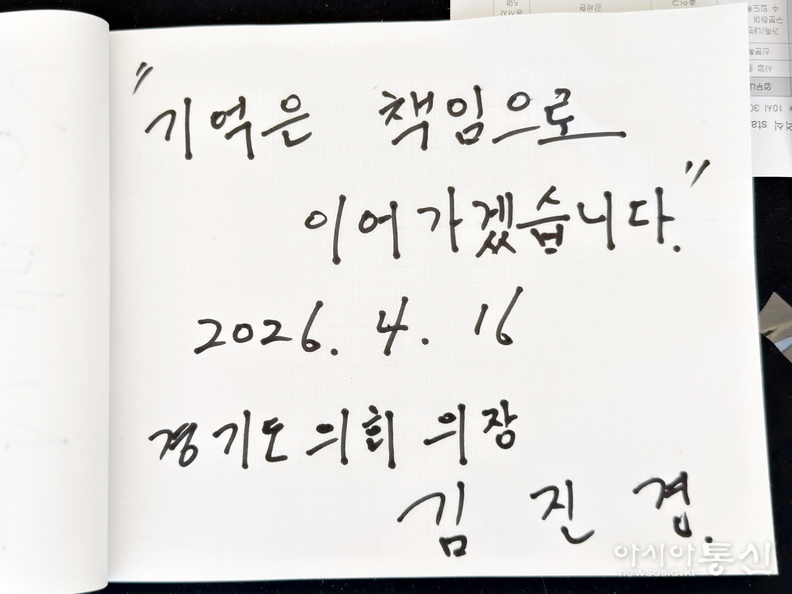 김 의장은 희생자들을 향해 묵념하며 깊은 애도의 뜻을 표했으며, 방명록에 는 “기억은 책임으로 이어가겠습니다”라는 추모의 글을 남겼다.