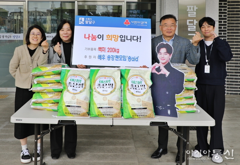 수원시 팔달구(구청장 황규돈)은 배우 송강 팬모임 ‘송aid’로부터 송강 배우의 생일(4월 23일)을 기념한 사랑의 백미 200kg을 전달받아 관내 취약계층 지원에 나선다고 밝혔다.