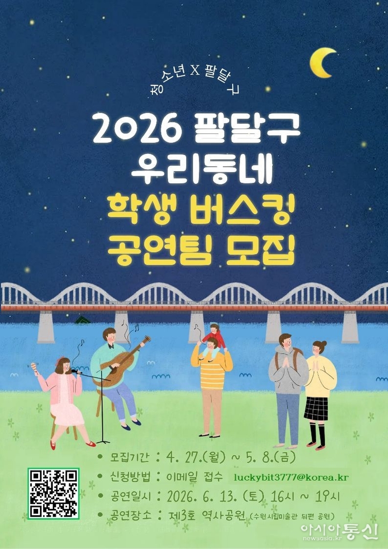 수원시 팔달구(구청장 황규돈)가 청소년들이 직접 주인공이 되어 공연에 참여하고 즐기는 ‘2026 팔달구 우리동네 학생 버스킹’의 공연팀을 모집한다고 밝혔다.