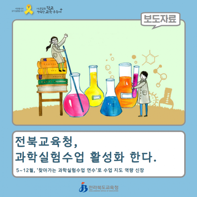 ​ 전라북도교육청은 초·중등 과학 교사 32명으로 구성된 과학실험연수지원단을 꾸리고 5월부터 12월까지 희망하는 학교를 대상으로 찾아가는 과학실험수업 연수를 진행한다고 밝혔다. 대상은 초·중·고 과학과 전 단원 신규 및 저경력 교사, 비전공교과 수업 교사, 기타 자발적 필요에 의해 과학실험 연수를 요청하는 경우에 해당하며, 실험 수업 지도 역량을 제고하고 과학실험 단원의 기본 개념 및 원리 이해를 도와 탐구·실험 수업을 활성화 할 계획​이다. ​ 찾아가는 과학실험수업 연수​는 단기적이고 집중적인 지원을 통해 실험지도 역량을 신장시키고, 희망하는 학교(교사)의 요구를 반영​하여 요청 교과(단원), 요청 시간과 장소에서 진행할 방침이다. 연수는 학교급별로 2시간씩 운영된다. ​ 아울러 실험연수 이외에 실험수업에 대한 추가 컨설팅 운영도 가능하며 코로나19 상황에 따른 방역 규칙을 준수해 운영될 예정이다. 전라북도교육청 관계자는 “실험 수업 지도 역량을 강화해 과학실험수업을 활성화하고 기본 개념 및 원리 이해의 외연을 확대할 것”이라며 “비전공 교과의 관련 실험 지도 역량 신장을 통한 과학수업 내실화를 기하고 과학 분야에 대한 학생의 이해와 관심을 증대시켜 나가겠다.”고 말했다.