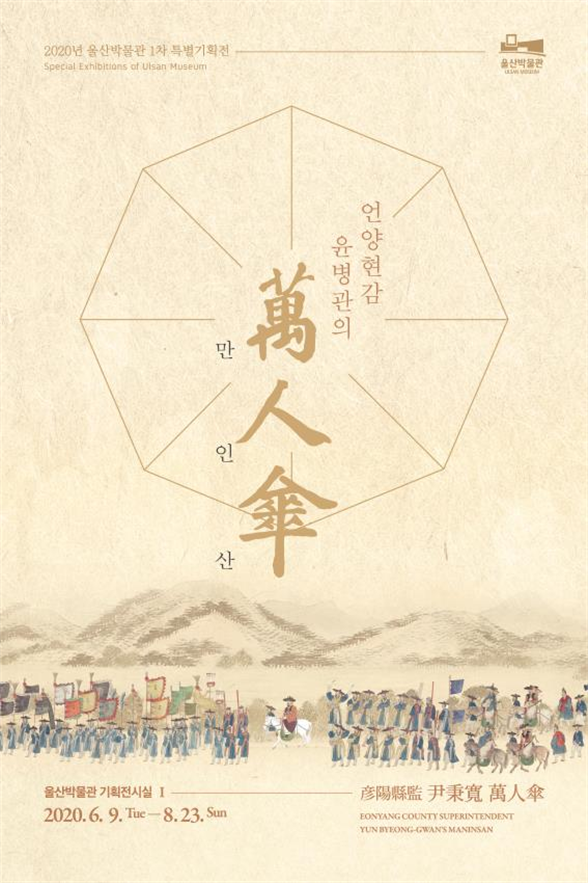 울산박물관은 2020년 첫 특별기획전인 ‘언양현감 윤병관의 만인산’을 6월 9일(화)부터 8월 23일(일)까지 개최한다고 밝혔다. 이번 전시는 2016년에 기증된 ‘만인산’을 통해 1887년 언양현감으로 부임한 윤병관의 생애와 당시 언양 지역 사회상, 지방수령의 선정 등에 대해서 살펴보고자 기획되었다. 만인산은 햇빛을 가리는 일산의 일종으로 처음에는 의장품의 하나로 사용되다가 19세기에 이르러 지방관의 선정을 기리기 위해 고을 사람들이 자신들의 이름을 수놓아 만들어지게 되었다. 언양현감 윤병관의 만인산은 1888년 7월에 제작된 것으로 추정되는데 통훈대부 행 언양현감 윤병관의 청덕과 선정이 영세토록 잊혀지지 않기를 바라는 만인산‘(通訓大夫行彦陽縣監尹候秉寬淸德善政永世不忘萬人傘)’이라는 송덕문과 함께 수산을 바치는 1,115명의 이름과 직함이 적혀있다. 전시는 윤병관의 일대기, 윤병관이 언양현감으로 부임했을 당시 언양지역의 사회상, 만인산을 기증받게 된 경위와 만인산의 보존처리 과정 등 총 3부로 구성되었다. 1부는 ‘조선후기 무관 윤병관’라는 주제로 윤병관이 언양현감으로 부임하기 전까지의 생애에 대해서 살펴본다. 1848년 파평 윤씨 판도공파 31세손으로 태어나 1866년 3월 무과에 급제한 후 여러 관직을 거치며 무관으로 승승장구하였다. 판도공파 세보를 비롯하여 각 관직의 임명 교지 등이 전시된다. 2부 ‘언양현감 윤병관’은 언양현감으로 부임한 윤병관의 선정과 당시 언양 지역의 상황에 대한 전시이다. 언양현감으로 윤병관의 치적은 만인산을 제작하면서 작성한 ‘포선저적문’에 잘 나타나있다. 학교를 중수하고, 성곽을 고쳐 쌓고 세금을 감해 주는 등의 선정을 확인할 수 있다. 3부에서는 만인산을 기증받게 된 경위와 만인산의 보존처리 과정에 대한 전시이다. 만인산을 기증한 윤정열 씨는 서울에 거주함에도 불구하고 언양현감이라는 직명을 보고 지역 박물관에 기증해야 한다는 사명감으로 울산박물관에 유물을 기증하게 되었다. 가문에서 보관하던 귀중한 유물이 박물관으로 와서 어떻게 보존처리되고 보관되는지에 대한 영상과 기증자의 인터뷰를 통해서 유물 기증에 대한 의미를 다시 한 번 살펴볼 수 있는 계기가 될 것이다. 울산박물관 관계자는 “이번 전시를 통해 조선시대 우리 지역의 역사와 인물에 대해 한 걸음 더 다가가는 계기가 되고 울산 지역 역사에 대한 역사적 고증의 장이 될 것으로 기대된다.”며 시민들의 많은 관람을 부탁드린다고 밝혔다.