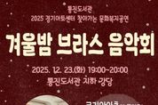 [아시아통신] 김포시 통진도서관은 오는 12월 23일 저녁 7시부터 8시까지 다가오는 연말을 기념하여 온 가족이 함께 즐길 수 있는 브라스 음악공연을 운영한다. 이번 공연은 경기아트센터에서 지원하는 ‘찾아가는 문화복지공연’ 사업으로, 김포시 북부권 시민들을 대상으로 일상 가까이에서 문화예술을 만나는 기회를 제공하고, 지역 간 문화 격차를 완화하고자 기획했다. 이번 공연은 금관 5중주로 구성된 앙상블 코리안아츠의 풍성한 선율로 채워질 예정이며, 코리안아츠는 대한민국 국제관악제 홍보대사와 2018년 평창동계올림픽 개막식 《승리의 팡파레》를 연주하는 등 화려한 이력을 지닌 팀으로, 클래식은 물론 영화와 대중음악 등 다양한 장르를 넘나들며 새로운 음악적 시도를 이어가고 있다. 도서관 관계자는 “이번 공연은 영화 및 애니메이션 음악공연으로 누구나 쉽게 즐길 수 있으며, 이번 공연을 통해 온 가족이 따듯한 연말을 보내길 바란다”라고 말했다.