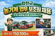 [아시아통신] 합천군은 농기계대여은행 운영체계를 강화하고 농업인 영농 편의를 높이기 위해 2026년 농기계 업무보조원 기간제근로자 9명을 채용한다고 14일 밝혔다. 이번 채용은 기간제근로자의 처우 개선을 통해 안정적인 일자리를 제공하고, 이를 바탕으로 농기계대여은행 이용 농업인들의 영농 편의를 실질적으로 향상시키기 위한 정책의 일환으로 추진된다. 채용 인원은 9명(기술직 8명, 민원응대 1명)이며, 선발된 인원은 농기계대여은행에서 농기계 입·출고 관리, 배송 지원, 임대장비 유지·관리 및 기초 점검, 농기계 순회 안전(수리)교육 지원, 농업인 민원 응대 등 현장 밀착형 업무를 수행하게 된다. 특히 합천군은 업무 숙련도와 전문성을 보수에 반영하는 기술등급별 임금체계를 적용해(99,910원/일~150,100원/일, 복리후생 수당 30만원/월), 농기계 정비수리 실기평가 결과에 따라 차등 지급함으로써 능력과 책임에 상응하는 합리적인 보상체계를 마련했다. 이를 통해 근로자의 근무 안정성과 책임성을 높이고, 서비스 품질 향상으로 이어지는 선순환 구조를 만든다는 방침이다. 채용 대상자는 농기계 분야 및 자
