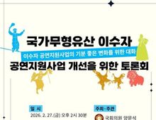 [아시아통신] 국가유산청은 양문석 국회의원, 국가유산진흥원과 함께 2월 27일 오후 2시 30분, 국가무형유산전수교육관 민속극장 풍류(서울 강남구)에서 '국가무형유산 이수자 공연 지원 사업 개선을 위한 토론회'를 공동 개최한다. 이번 토론회는 국가무형유산 이수자 공연 지원 사업의 운영 현황을 점검하고, 현장의 다양한 의견을 수렴하여 향후 제도 개선 방향을 모색하기 위해 마련됐으며, 전통 공연·예술 분야 전문가 및 이수자 등 150여 명이 참석하여 이수자 공연 지원 사업의 발전을 위한 다양한 의견을 교류할 예정이다. 토론회는 ‘국가무형유산 이수자 공연 지원 사업의 문제점 및 개선 방안’을 주제로 진행된다. 먼저, 기존 사업의 운영 현황과 이번 토론회에 앞서 전통 공연·예술 분야 이수자 등을 대상으로 실시한 설문조사 결과를 살펴본다. 이어서 국가무형유산 이수자 및 전통 공연 연출·방송 등 각 분야의 전문가들이 기존 지원 방식의 한계와 개선 방안 등을 논의한 뒤, 실제 정책 수요자인 이수자들의 현장 의견을 직접 청취하는 순서로 진행된다. 국가유산청은 이번 토론회에서 제시된 다양한 의견과 제안을 면밀히 검토하여, 국가