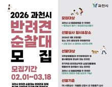 [아시아통신] 과천시가 반려견과 함께하는 산책 활동에 방범 순찰 기능을 접목한 ‘과천시 반려견순찰대’ 신규 대원을 오는 3월 18일 오후 4시까지 공개 모집한다. ‘반려견순찰대’는 주민이 반려견과 거주지 주변 산책을 하며 범죄나 생활안전 위험 요소를 발견할 경우 즉시 112나 120으로 신고하는 주민 참여형 치안 활동이다. 순찰 시에는 견주와 반려견 모두 순찰복을 착용하며 전용 앱을 통해 순찰일지를 작성하게 된다. 선발된 반려견순찰대에게는 활동에 필요한 온라인 교육과 전문 훈련사가 동반하는 합동 교육 순찰의 기회가 제공되며, 연말에는 우수 대원에게 감사장을 수여하는 등 다양한 지원을 통해 자긍심을 높일 계획이다. 모집 대상은 동물등록된 반려견을 키우고 있는 과천 시민이며 강아지 유모차를 이용하는 보호자도 신청할 수 있다. 신청은 3월 18일까지 반려견순찰대 공식 누리집을 통해 가능하다. 선발 심사는 3월 21일 과천 중앙공원 야외음악당에서 진행된다. 전문 훈련사가 반려견의 ▲ 리드 워킹(따라 걷기) ▲ 명령어 이행(기다리기, 앉기) ▲ 외부 자극 반응(대인‧대물‧대견) 등을 종합적으로 평가해 약 2