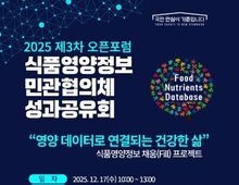 [아시아통신] 식품의약품안전처는 빅데이터 기반 개인 맞춤 영양관리의 필수 요소인 식품영양성분 통합 데이터베이스(DB)의 활성화 방안 등을 논의하기 위한 ‘2025년 제3차 식품영양정보 민관협의체’ 오픈 포럼을 12월 17일 개최한다. 식약처는 2023년부터 식품영양성분 DB 활용성 강화와 현장 애로사항 해소를 위해 산·학·연·관이 참여하는 민관협의체를 운영해 왔다. 이번 포럼에서는 영양성분 데이터 보완을 위한 소그룹 활동인 ‘채움 프로젝트(Fill Project)’ 운영 등 ‘25년 주요 성과를 공유하고 수요 기반의 식품영양 DB 고도화, 활용성 강화를 위한 민관 협력 방안 등을 논의한다. 특히, ‘채움 프로젝트’는 식단 관리 앱 등에서 활용 수요는 높지만 영양표시 의무 성분이 아니어서 DB 확보에 어려움이 컸던 칼슘 등 영양 정보를 업체가 보유한 데이터로 제공받아 채우는 것으로 민간에서 먼저 제안되어 추진한 사업이다. 협의체에 참여한 AI 헬스케어 서비스 업체 ‘두잉랩’ 관계자는 “칼슘 등 일부 정보가 부족해 개인 맞춤형 영양관리 앱 개발 시 정확성에 한계가 있었지만, 채움 프로젝트를 통해 DB가