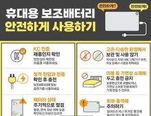 [아시아통신] 휴대용 보조배터리 안전하게 사용하기 ■ 사용 전 KC 인증 제품인지 확인 안전성이 확인된 제품을 사용하세요. 정격 전압과 전류 확인 후 충전 보조배터리에 맞는 충전기를 사용하세요. 배터리 상태 주기적으로 점검 팽창, 변색, 파손 여부 등을 확인하고 이상이 있으면 즉시 폐기하세요. ■ 사용 중 고온·다습한 환경에서 보관 및 사용 않기 직사광선, 차량 내부, 난방기구 주변, 욕실 등에서 사용을 피하세요. 이불 등 가연성 소재에 두고 충전 금지 보온현상으로 과열되거나, 가연성 소재로 인해 화재가 크게 번질 수 있어요. 외부 충격에 주의하기 떨어뜨리거나 무거운 물건에 눌리지 않도록 주의하세요. ■ 충전 시 충전이 끝나면 신속하게 전원 분리 ! 과충전 시 화재 위험이 증가해요. 전자기기와 동시 충전 금지 보조배터리를 충전하면서 다른 전자 기기를 연결하여 장시간 사용하지 마세요. 과열이나 특이한 냄새가 나면 사용 및 충전 중단 ■ 보관 시 100% 충전 상태로 장기 보관하지 않기 배터리 이상 상태 발생 시 화재 위험이 증가할 수 있어요. 금속류(동전, 장신구, 열쇠 등)와 분리해서 보관 입·출력 단자에 금속이 닿으면 화재 위험이 있어요. [뉴스출처 : 산