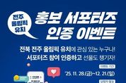 [아시아통신] 전북특별자치도는 전주 하계올림픽 유치를 향한 국민적 관심과 응원을 모으기 위해 다음 달 21일까지 '전주 올림픽 유치 홍보 서포터즈 인증 이벤트'를 진행한다고 1일 밝혔다. 도는 국민과 함께 만들어가는 전주 올림픽 유치를 목표로 지난 8월부터 홍보 서포터즈를 모집·운영 중이다. 약 1,900명이 참여하고 있는 서포터즈는 개인 SNS 등 온라인 채널을 통해 전주 올림픽 유치 소식을 자유롭게 공유하며, 올림픽 개최의 필요성과 의미를 국민에게 널리 전파하는 역할을 담당하고 있다. 이번 인증 이벤트는 서포터즈 가입 후 발급받은 위촉장을 개인 SNS에 지정 해시태그(#전북전주올림픽, #홍보서포터즈, #올림픽유치응원)와 함께 게시하고, 새로 제작된 전주 올림픽 유치 홍보 영상에 '좋아요'와 응원 댓글을 남긴 뒤, 네이버 폼으로 참여 신청을 마치면 된다. 참가자 중 무작위 추첨으로 커피 기프티콘(2만원권 100명, 1만원권 200명) 등 총 300명에게 경품을 증정한다. 또한 서포터즈 활동 실적을 종합 평가해 우수 활동자를 선발하고, 오는 12월 말 전북특별자치도지사 표창과 기념품을 수여할 예정이