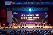 [아시아통신] 경상국립대학교는 10월 20일 오전 10시 가좌캠퍼스 GNU컨벤션센터 2층 대강당에서 개교 77주년 기념식을 개최했다. 개교기념식은 개식, 국민의례, 대학 연혁 보고, 개척시 낭송, 총장 기념사, 축사, 시상식, 비전 선포식, 교가 제창, 기념 촬영 등의 순으로 진행했다. 개교기념식 행사는 경상국립대학교 유튜브 채널을 통해 실시간 송출했다. 경상국립대학교는 기념식에서 각종 시상식[개척명예장, 총장 특별상, 개척한림원 표창, 7인의 영리서처(Young Researcher) 현판 수여, 장기근속상]을 마련하여 대학 발전에 기여한 교내·외 인사와 우수 연구자들의 공로를 기렸다. ▲개척명예장은 ㈜영남소방엔지니어링 류상수 대표에게 수여했다. 류상수 대표는 경상국립대학교 농업기계공학과를 졸업(1982년)했으며, 삼성공조(주), 안전보건공단 등을 거쳐 1996년에 ㈜영남소방엔지니어링에 입사 후 2005년 대표이사로 취임했다. 3월 14일 대학발전기금 1억 원을 출연하며 “나눔을 받아야 하는 대상은 많지만 모교 후배들의 장학을 위한 발전기금으로 기부하는 것이 무엇보다도 가치 있는 일이고, 그들로 하여금 또 다른