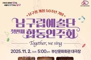 [아시아통신] 부산 남구는 오는 11월 2일 오후 17시 부산문화회관 대극장에서‘남구립예술단 합동 연주회 Together, We Sing’을 개최한다. 남구립예술단은 ▲소년소녀합창단(지휘 김주곤) ▲오륙도여성합창단(지휘 곽기웅) ▲욜드합창단(지휘 고영호)으로 구성되어 있으며, 남구를 대표하는 문화사절단으로 활발히 활동하고 있다. 이번 연주회는 남구청 개청 50주년을 기념하여 세 합창단이 처음으로 함께하는 합동 연주회라는 점에서 특별한 의미를 지닌다, 각 합창단의 개성과 감성을 담은 다채로운 무대를 통해 관객에게 풍성한 음악적 경험을 선사할 것으로 기대된다. 소년소녀합창단은 맑고 순수한 목소리로 음악극‘푸른 하늘 은하수’를 선보이고, 오륙도여성합창단은 ‘그리움 그리고 사랑’이라는 테마로 세대를 이어주는 따뜻한 감성의 하모니를 들려주며, 욜드합창단은 인생의 깊이와 여운이 느껴지는 ‘행복한 인생’이라는 감동의 무대를 마련했다. 특히 이번 공연의 하이라이트는 세 합창단이 함께 꾸미는 합동무대다. 서로 다른 세대의 목소리가 한 무대에서 하나의 선율로 어우러지며, 노래를 통해 마음을 나누고 세대를 잇는 특별
