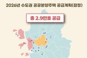 [아시아통신] 국토교통부와 4개 공공기관은 ’26년 수도권 공공택지에서 총 2.9만호 규모의 공공분양주택을 순차적으로 공급할 계획이라고 밝혔다. 이번 공급 물량은 새정부 「주택공급 확대방안」(9·7대책)에서 발표한 수치(2.7만호) 대비 약 2천호 증가한 규모로, 판교(2.9만호)급 신도시를 하나 새로 조성한 것에 준하는 수준이다. 특히, 4개 공공기관의 올해 분양 물량(2.2만호)보다 32.2% 증가했고, 최근 5년간 평균 수도권 분양 물량(1.2만호)의 약 2.3배 수준으로, 공공 부문의 착공 확대 노력의 성과가 가시화되며, 공급 확대 국면으로 전환되고 있음을 보여준다. 내년에 분양될 단지들을 살펴보면, 지역별로는 △서울 1.3천호, △인천 3.6천호, △경기 23.8천호로 분포되어 있고, 주요 지구별로는 △3기 신도시 7.5천호, △2기 신도시 7.9천호, △기타 중소택지 13.2천호의 공공주택이 분양될 예정이다. 3기 신도시에서는 △고양창릉(3,881호), △남양주왕숙(1,868호), △인천계양(1,290호), 2기 신도시에서는 △광교(600호), △평택고덕(5,134호), △화성동탄2(4