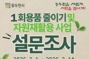 [아시아통신] 동두천시는 깨끗한 도시환경 조성을 위해 추진 중인 '1회용품 줄이기 및 자원 재활용 사업'의 기초자료로 활용하고자 시민 설문을 실시한다. 이번 설문은 동두천시민이면 누구나 참여할 수 있도록 개인정보 수집, 회원 등록, 로그인 등 별도 절차를 생략하고, 링크 또는 QR코드를 통해 바로 참여할 수 있게 구성했다. 참여 방법은 네이버 설문 링크 링크, 또는 QR코드를 이용하면 되며, 설문은 총 10개 문항으로 이뤄져 있다. 시 관계자는 “10대부터 어르신까지 다양한 시민의 의견을 폭넓게 듣기 위해 시 SNS와 관련 단체를 통해 설문 링크를 공유하고 있다”라며 “설문을 안내받은 시민들도 가족과 지인에게 공유해 참여를 독려해 달라”라고 밝혔다. 박형덕 동두천시장은 “이번 설문 참여와 함께 가정·직장·학교 등 일상에서 1회용품 사용을 줄이고 자원을 재활용하는 실천에 동참해 주시길 바란다”라며 “시는 설문 결과를 바탕으로 관련 사업을 적극 추진하겠다”라고 말했다.