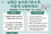 [아시아통신] 남해군은 ‘농어촌 기본소득 시범사업’ 신청 접수를 오는 12월 30일부터 2026년 1월 30일까지 실시한다고 밝혔다. 농어촌 기본소득 시범사업은 남해군에 주민등록을 두고 실제 거주하는 군민을 대상으로 하며, 대상자로 확정될 경우 월 15만 원을 지역사랑상품권(카드형·선불카드)으로 지급하는 사업이다. 신청 대상은 신청일 기준 30일 이상 남해군에 주소를 두고 실제 거주 중인 주민으로, 군 복무자, 타 지역 대학생, 시설 입소자 등 실제 거주가 불분명한 경우는 제외된다. 신청은 주소지 관할 읍·면 행정복지센터 총무팀을 방문해 본인이 직접 신청해야 하며, 신분증을 반드시 지참해야 한다. 미성년자나 피후견인의 경우에는 법정대리인을 통한 대리 신청이 가능하며, 이 경우 대리인 신분증과 가족관계증명서 등 관계를 확인할 수 있는 서류를 제출해야 한다. 거주 시기에 따라 신청 요건도 달라진다. 2025년 10월 19일 이전부터 거주한 기존 주민은 최초 접수 기간 내 신청이 가능하며, 2025년 10월 20일 이후 전입한 신규 거주자는 전입일로부터 30일이 경과한 이후 신청할 수 있다. 신규 전입자는 매매·임대